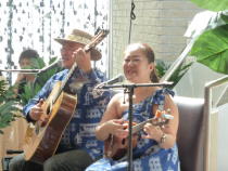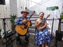 | ホーイケでも演奏してくださった KO`OLUA をお招きしてライヴを開催しました。 Slack-Key GuitarとUkuleleの素敵なサウンドにMartyさんNolikoさんの美しいハーモニーが重なり、会場中がうっとり。 後半は、KO`OLUAの演奏でお客さんがHulaを踊る盛り上がり様。大変楽しいステージでした。 ライブ開始前には KO`OLUAのMartyさんを講師に、Slack-Key Guitarのワークショップも行われ、初めての方から経験者の方まで、こちらも定員オーバーの盛況でした。 |